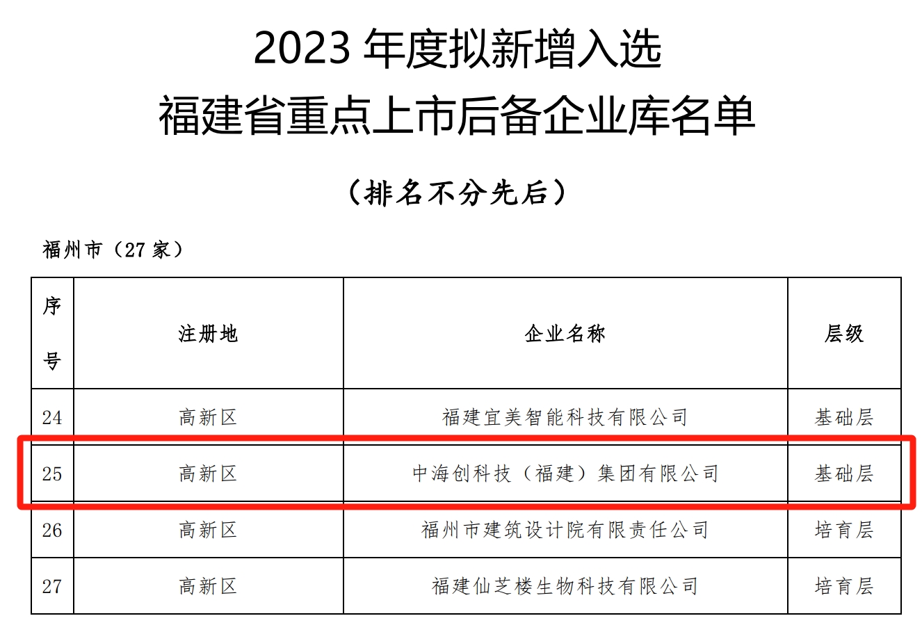 近日,福建省地方金融监督管理局公布“2023年度拟新增入选福建省重点上市后备企业库名单”,中海创集团成功入选省重点上市后备企业梯队。